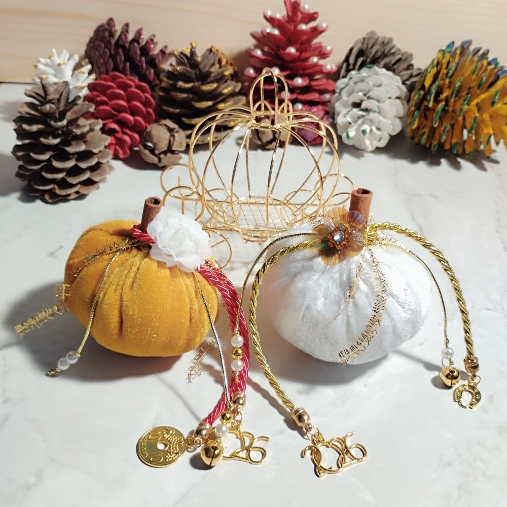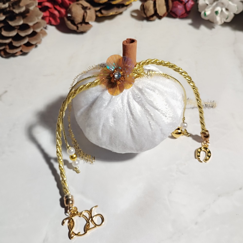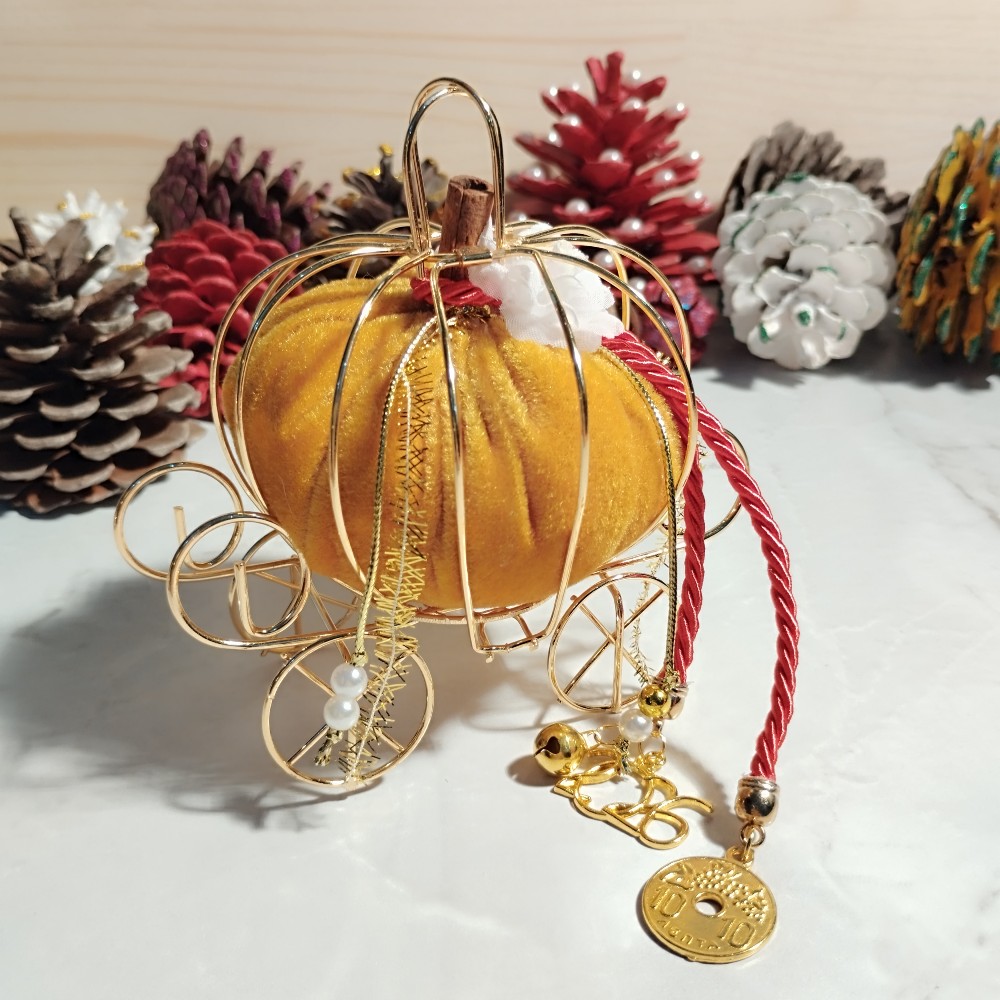 Χειροποίητο, οικονομικό, επιτραπέζιο γούρι 2026 με χρυσή μεταλλική άμαξα και στολισμένη χρυσή ή λευκή κολοκύθα.