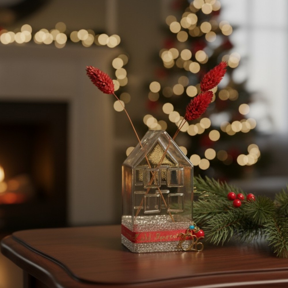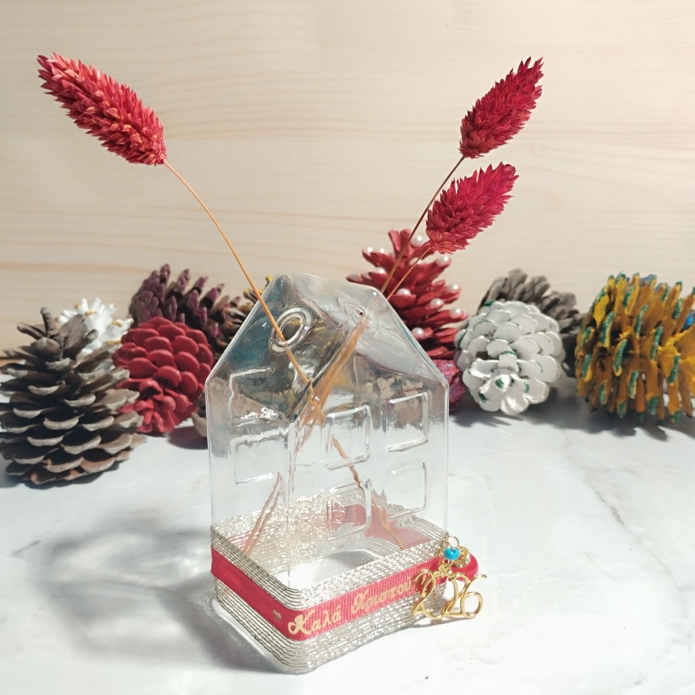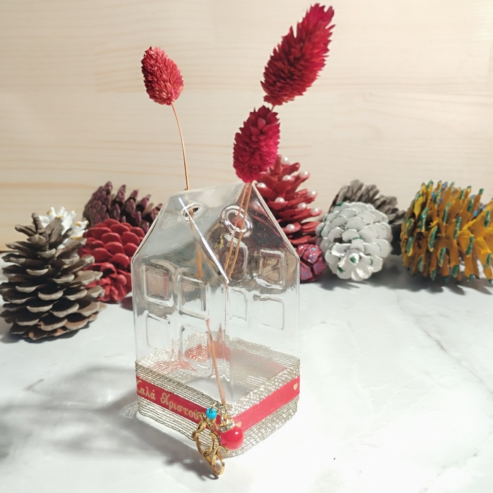 Χειροποίητο, οικονομικό, επιτραπέζιο γούρι 2026 γυάλινο διάφανο σπίτι.