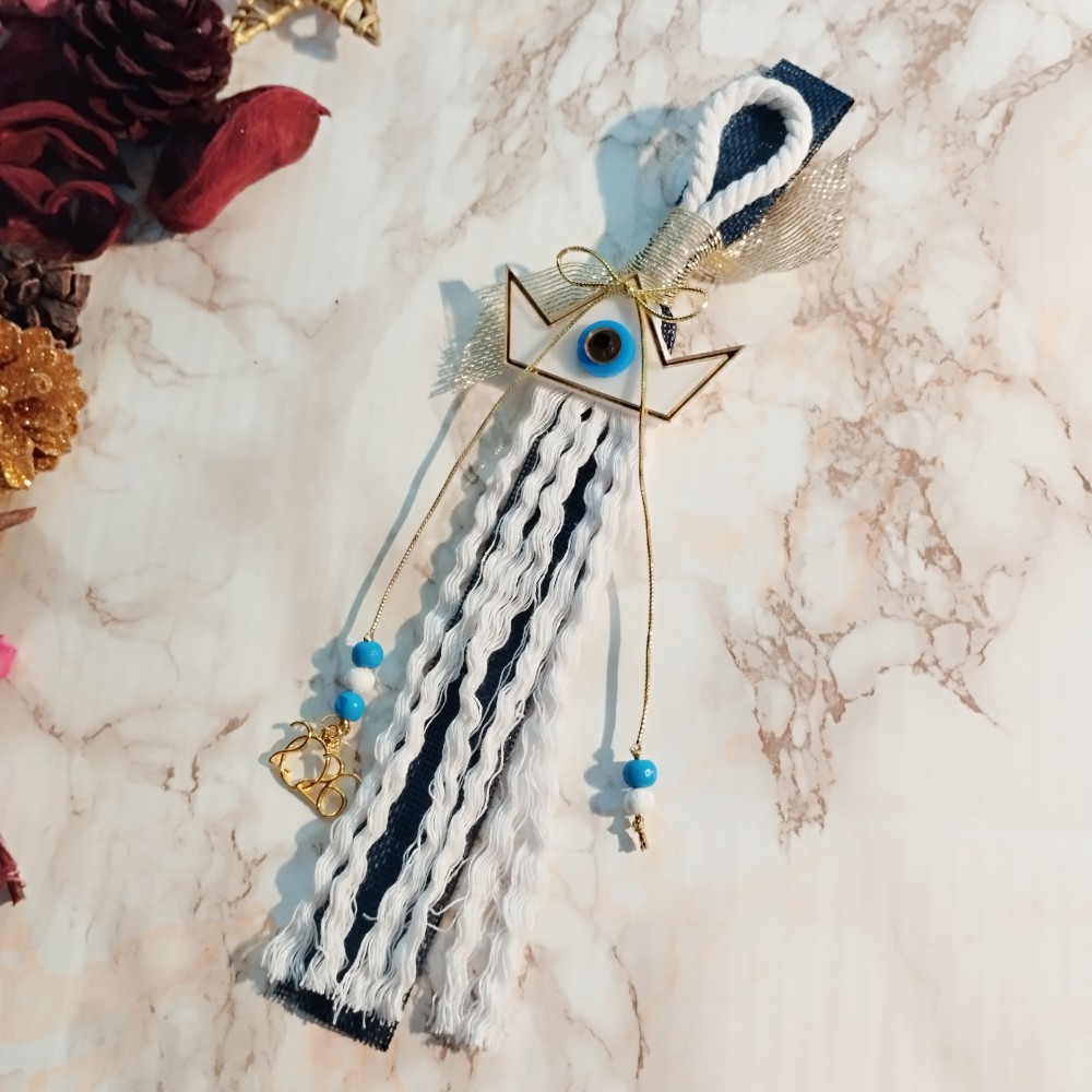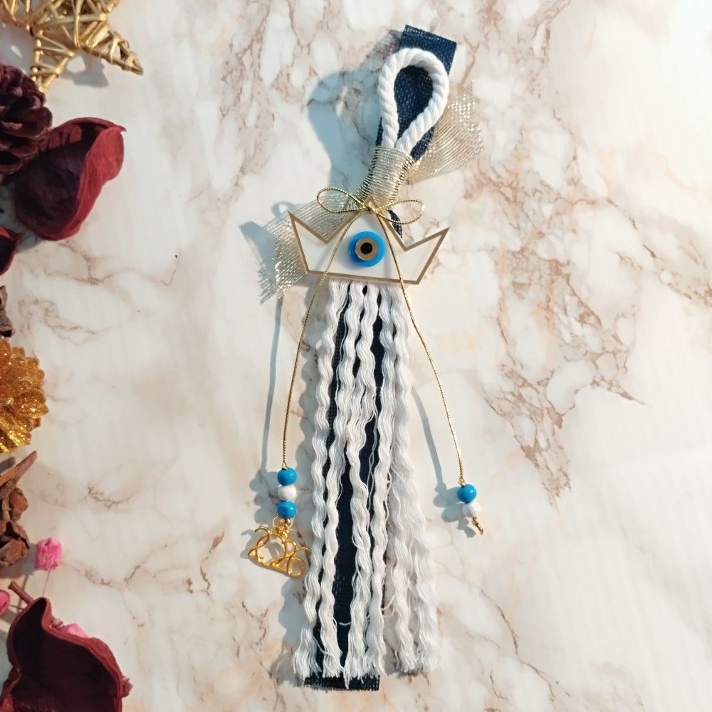 Χειροποίητο, οικονομικό, κρεμαστό γούρι 2026 με καράβι από πλέξι σε λευκό και χρυσό χρώμα με μάτι από πλέξι.