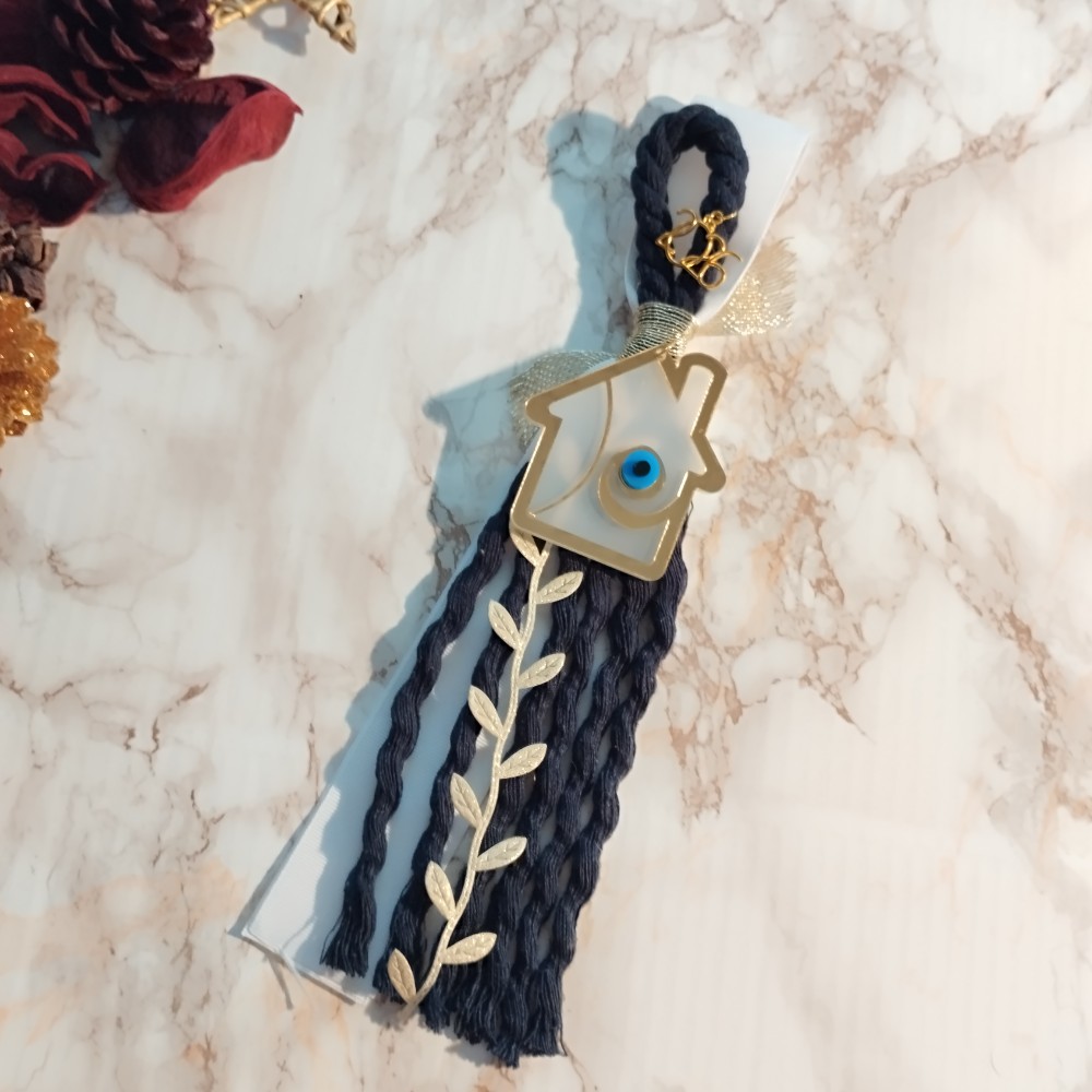 Χειροποίητο, οικονομικό, κρεμαστό γούρι 2026 με σπίτι από πλέξι σε λευκό και χρυσό χρώμα με μάτι από πλέξι.