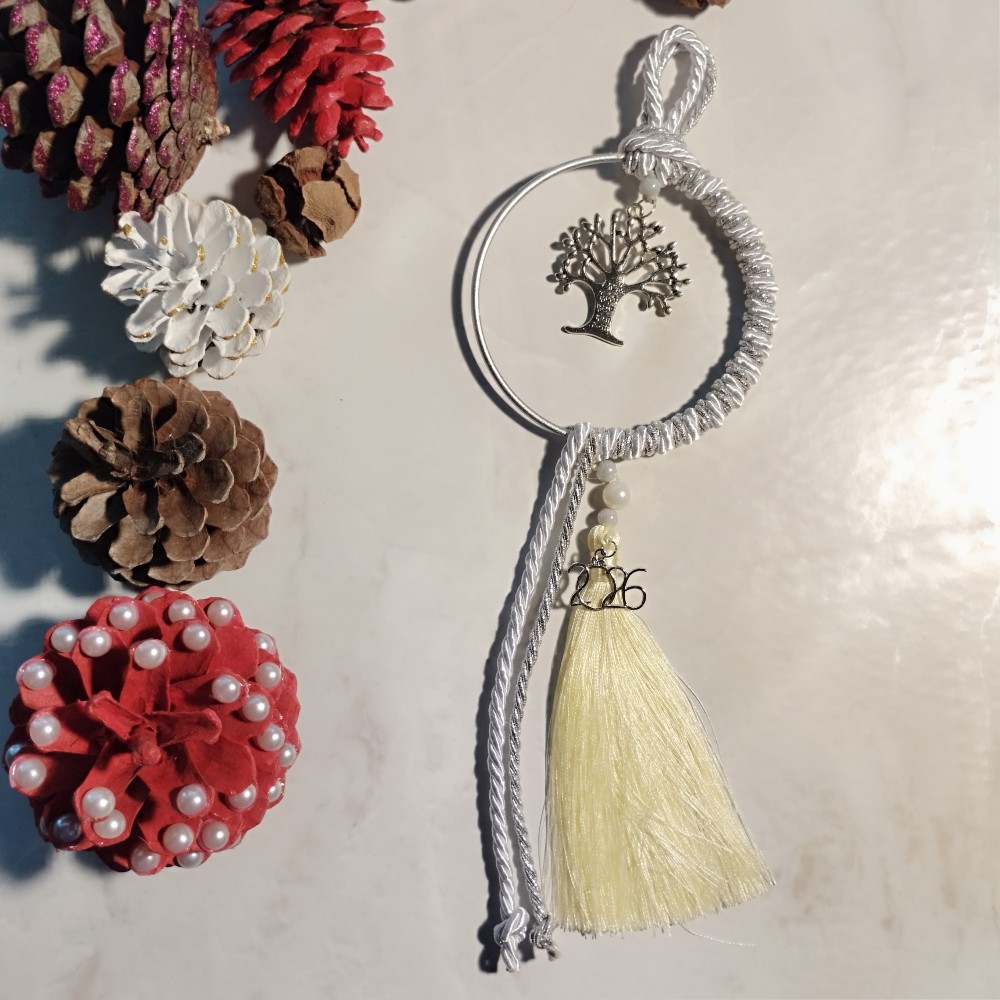 Χειροποίητο, οικονομικό, κρεμαστό γούρι 2026 με ασημί κρίκο “ντυμένο” με λευκό και ασημί γυαλιστερό κορδόνι.