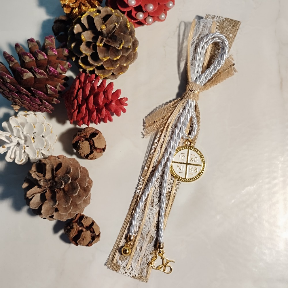 Χειροποίητο, οικονομικό, κρεμαστό γούρι 2026 με μεταλλικό χρυσό κωσταντινάτο με λευκό σμάλτο.