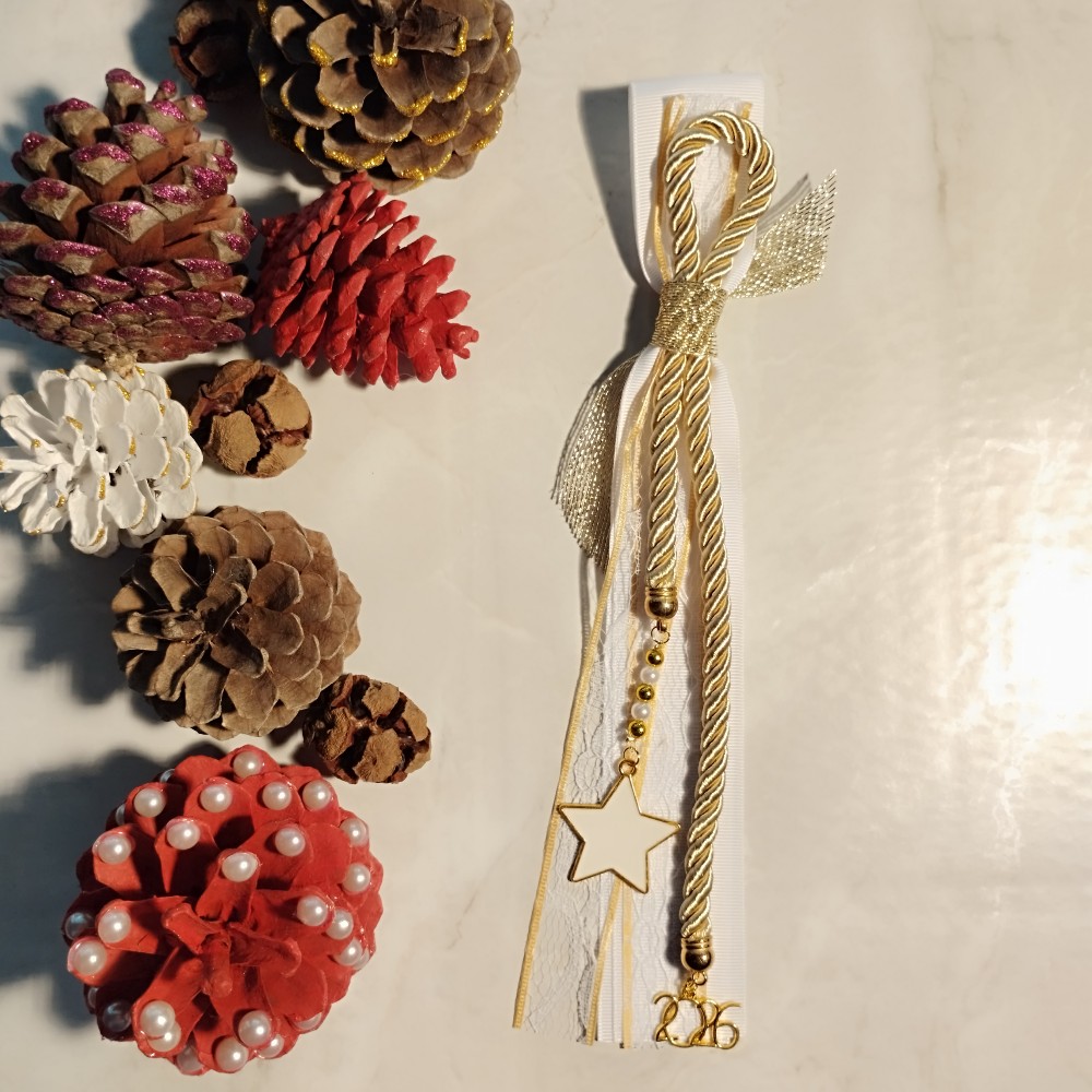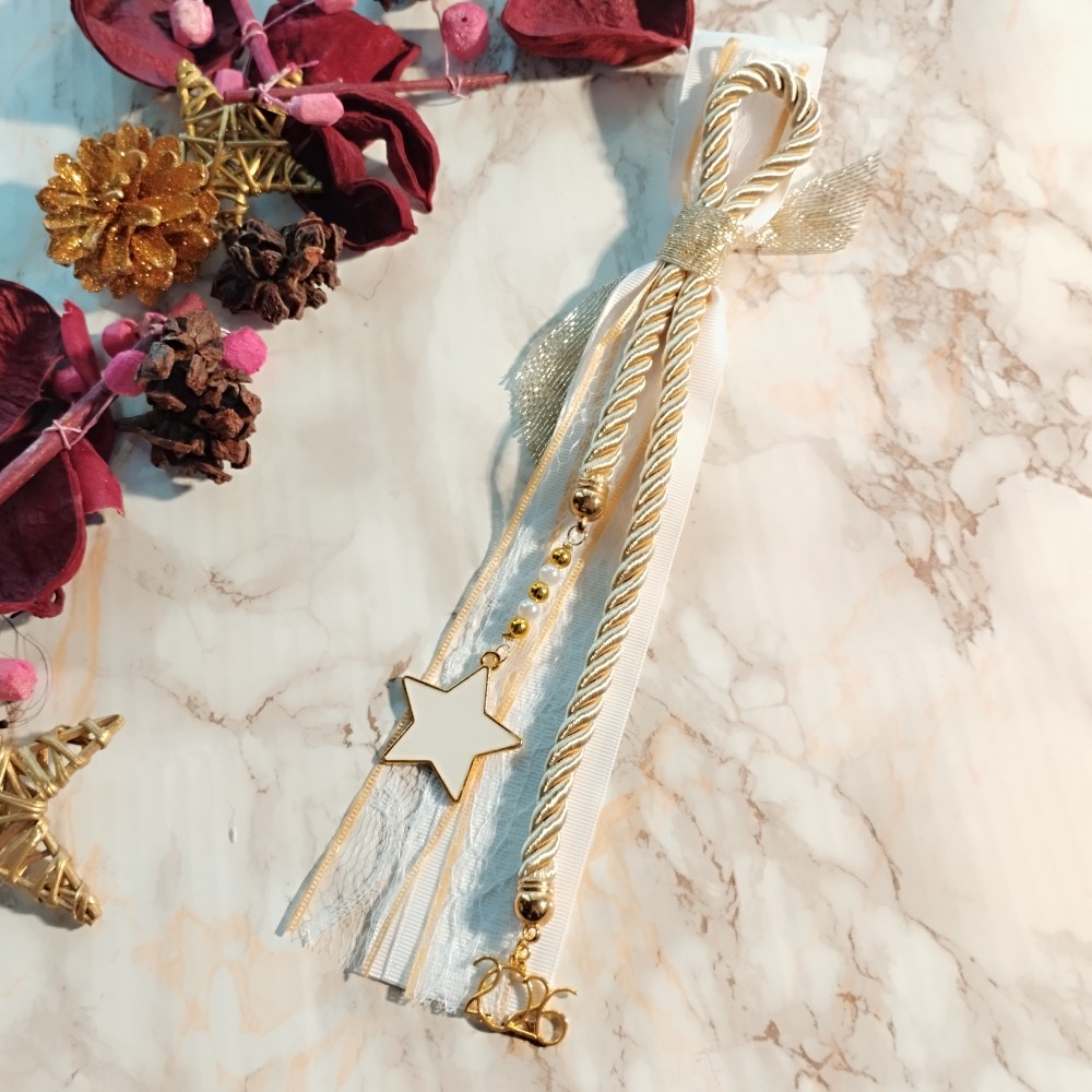 Χειροποίητο, οικονομικό, κρεμαστό γούρι 2026 με μεταλλικό χρυσό αστέρι με λευκό σμάλτο.