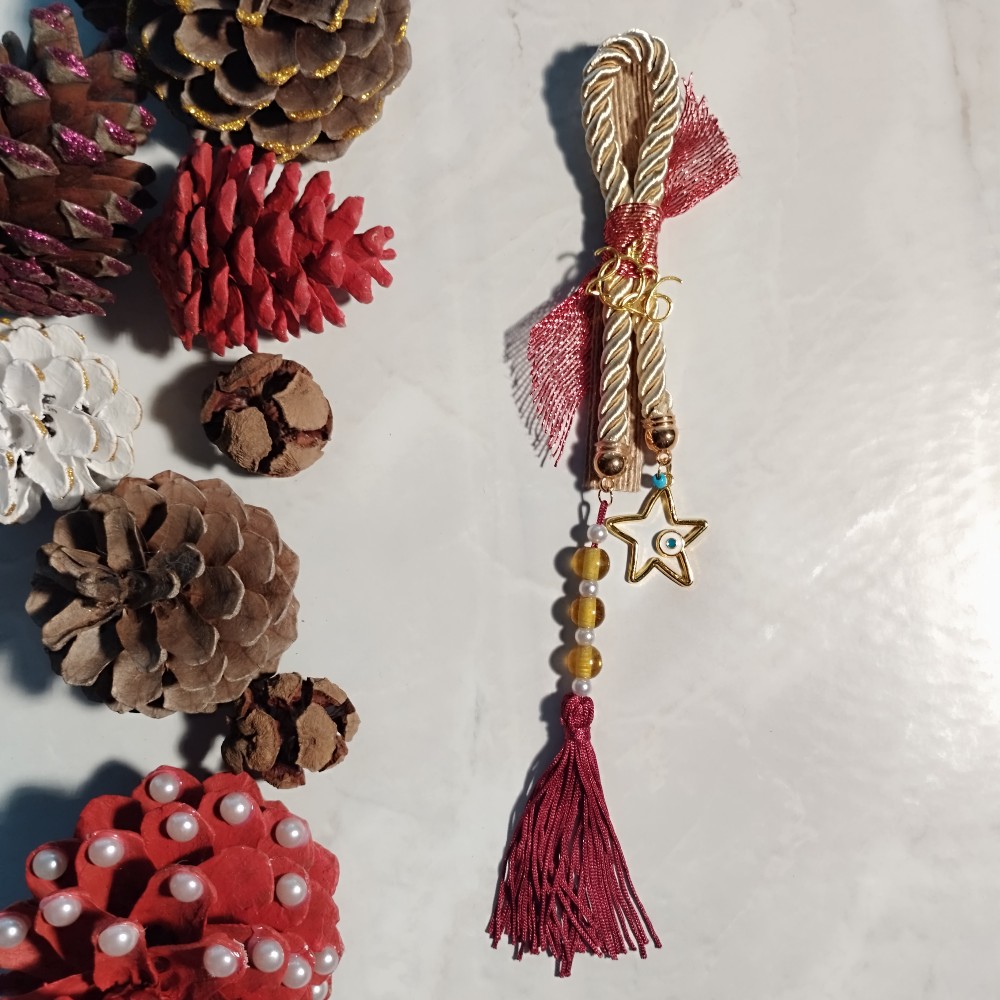 Χειροποίητο, οικονομικό, κρεμαστό γούρι 2026 με μεταλλικό χρυσό αστέρι με μάτι από λευκό και σιελ σμάλτο .