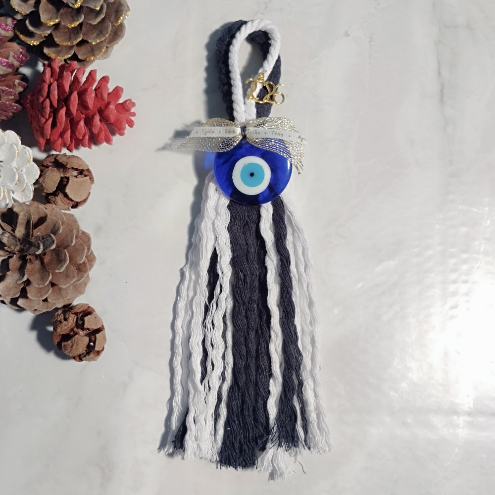 Χειροποίητο, οικονομικό, κρεμαστό γούρι 2026 με μπλε μάτι από φυσικό γυαλί.