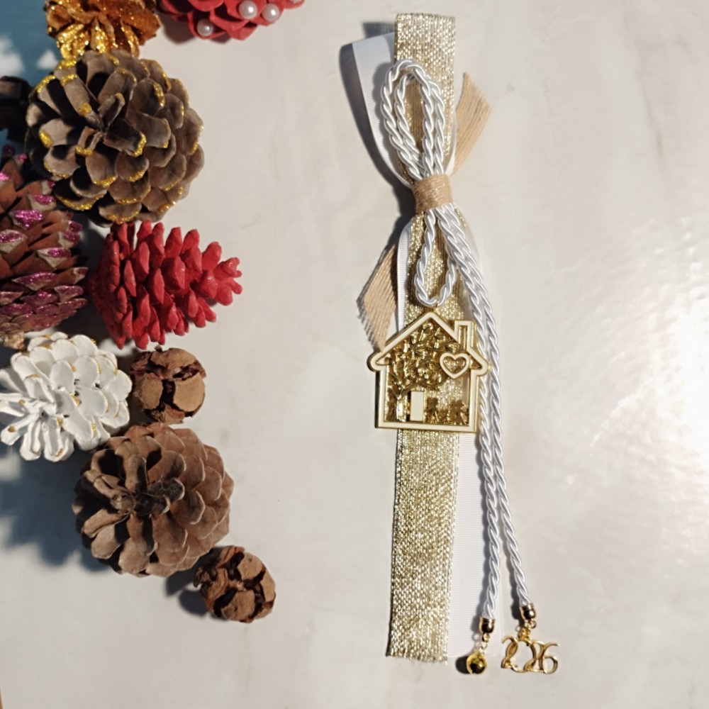 Χειροποίητο, οικονομικό, κρεμαστό γούρι 2026 με μεταλλικό σπίτι με οικογένεια σε χρυσό χρώμα με λευκό σμάλτο.