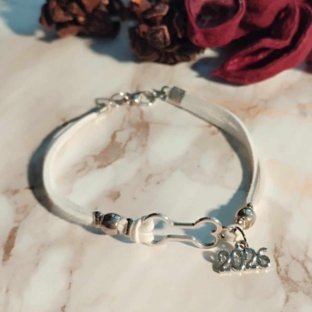 Οικονομικό χειροποίητο Γούρι 2026 βραχιόλι με επάργυρο κόκαλο και ασημί μεταλλικές χάντρες με σταθερό κούμπωμα σε λευκό σουέτ δέρμα.