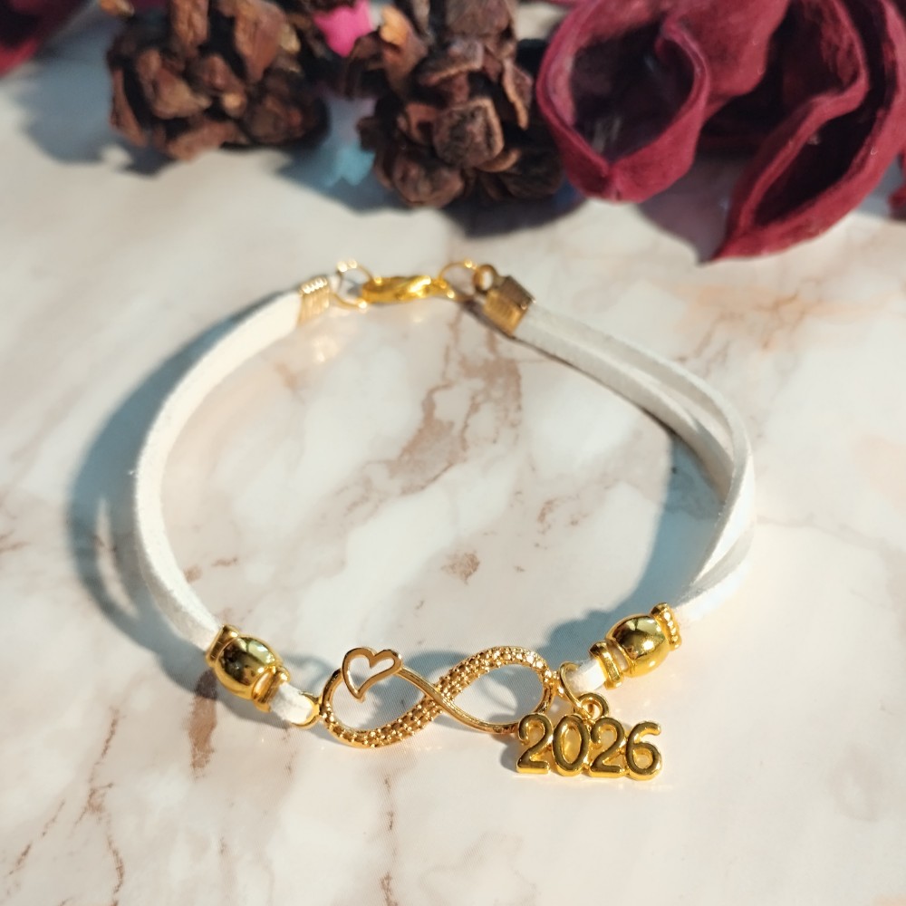 Βραχιόλι Γούρι 2026 επίχρυσο Άπειρό με Καρδιά σε λευκό Σουέτ Δέρμα