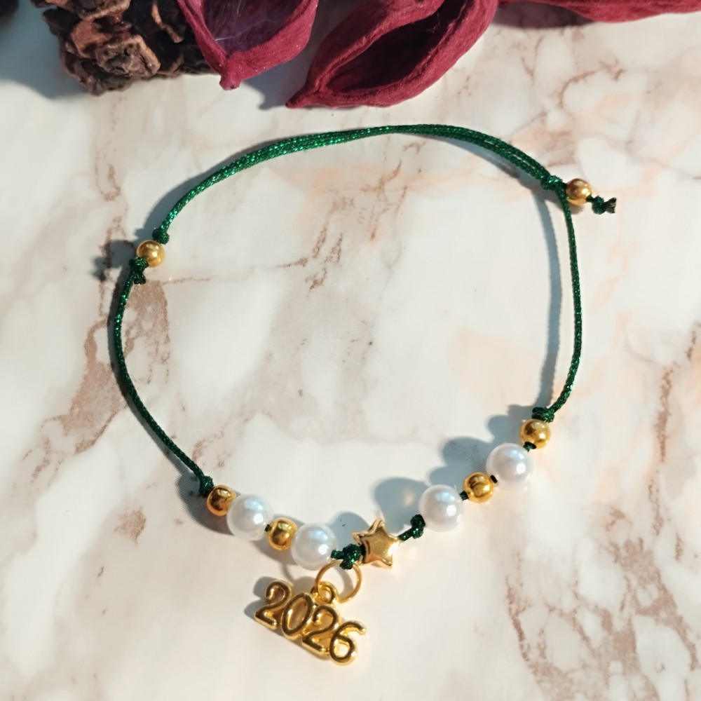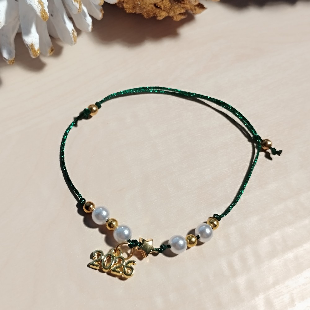 Βραχιόλι Γούρι 2026 επίχρυσο Αστέρι με Πέρλες σε κυπαρισσί Γυαλιστερό κορδόνι