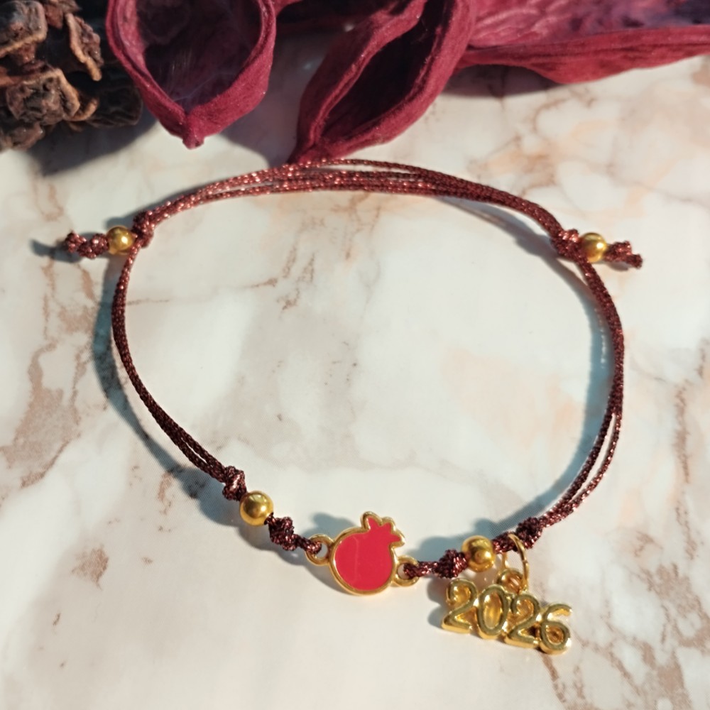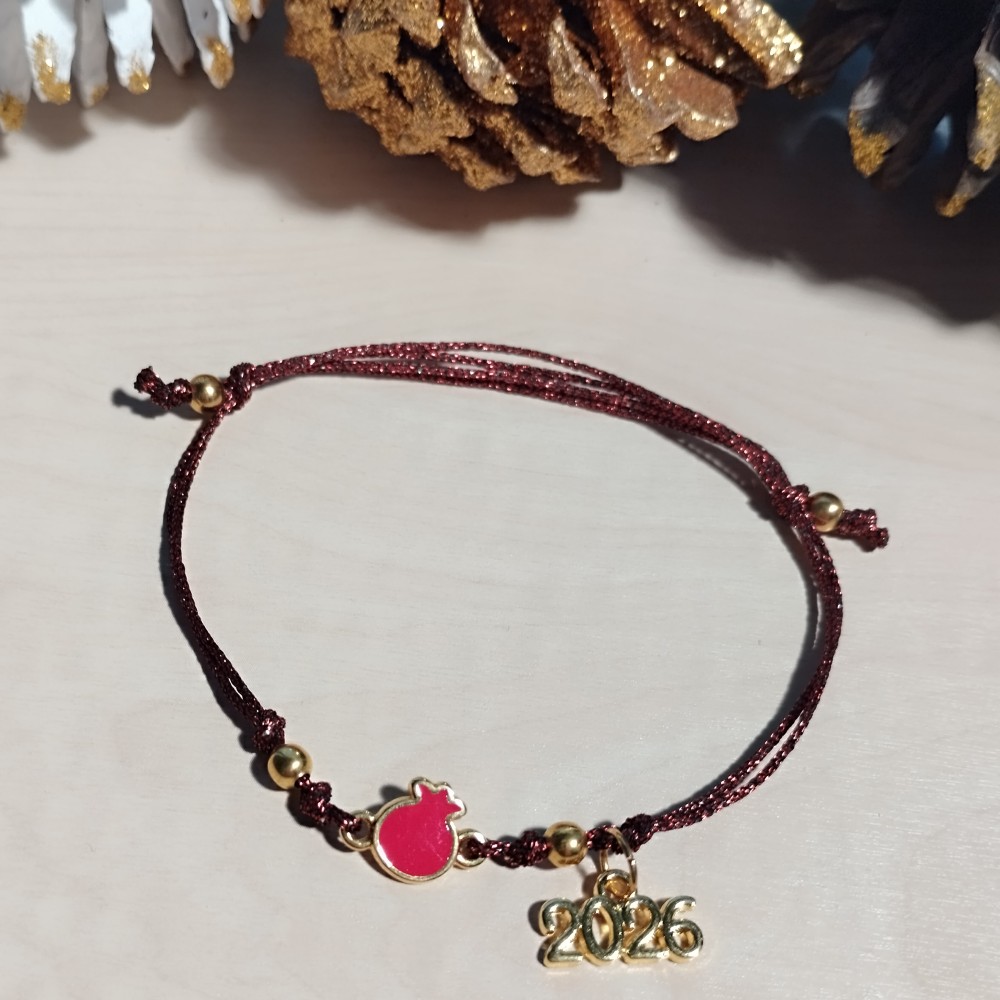 Βραχιόλι Γούρι 2026 επίχρυσο Ρόδι με κόκκινο Σμάλτο σε Γυαλιστερό μπορντό κορδόνι