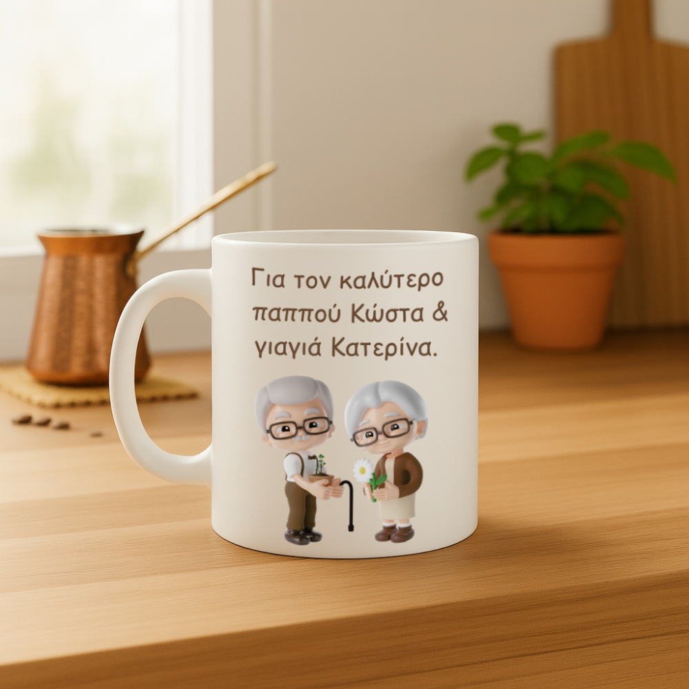 Δυνατότητα προσωποποίησης στη κούπα, γράψτε μας τα δικά σας ονόματα για τη γιαγιά- παππού και το εγγόνι.