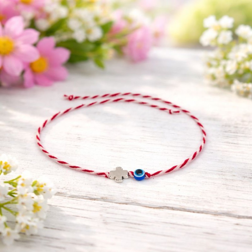 Οικονομικό χειροποίητο Μαρτάκι με σταυρουδάκι ασημί επάργυρο 999 και μπλε μάτι.