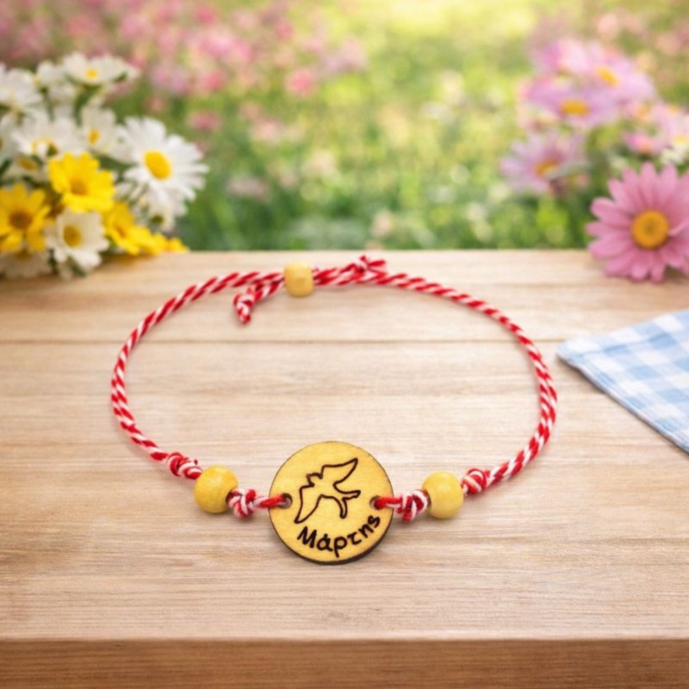 Οικονομικό χειροποίητο Μαρτάκι με ξύλινο στοιχείο στρογγυλό ”ΜΑΡΤΗΣ” ΧΕΛΙΔΟΝΙ σε φυσικό χρώμα.