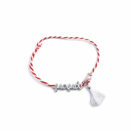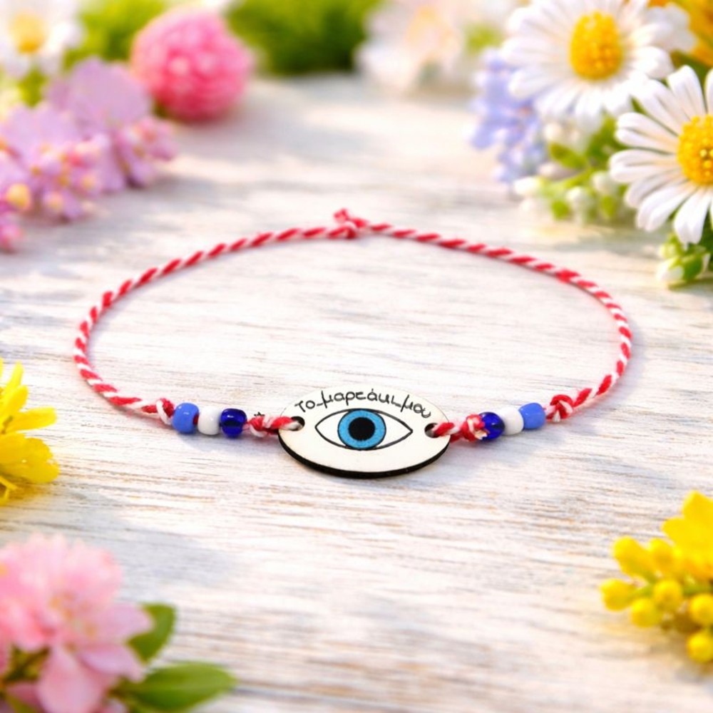 Οικονομικό χειροποίητο Μαρτάκι με Ξύλινο στοιχείο οβάλ “ΤΟ ΜΑΡΤΑΚΙ ΜΟΥ” με μάτι γαλάζιο.