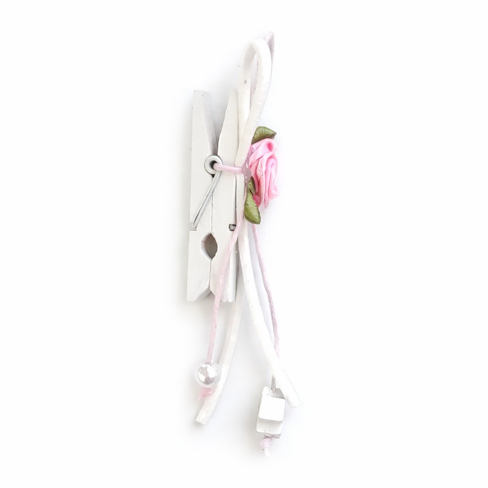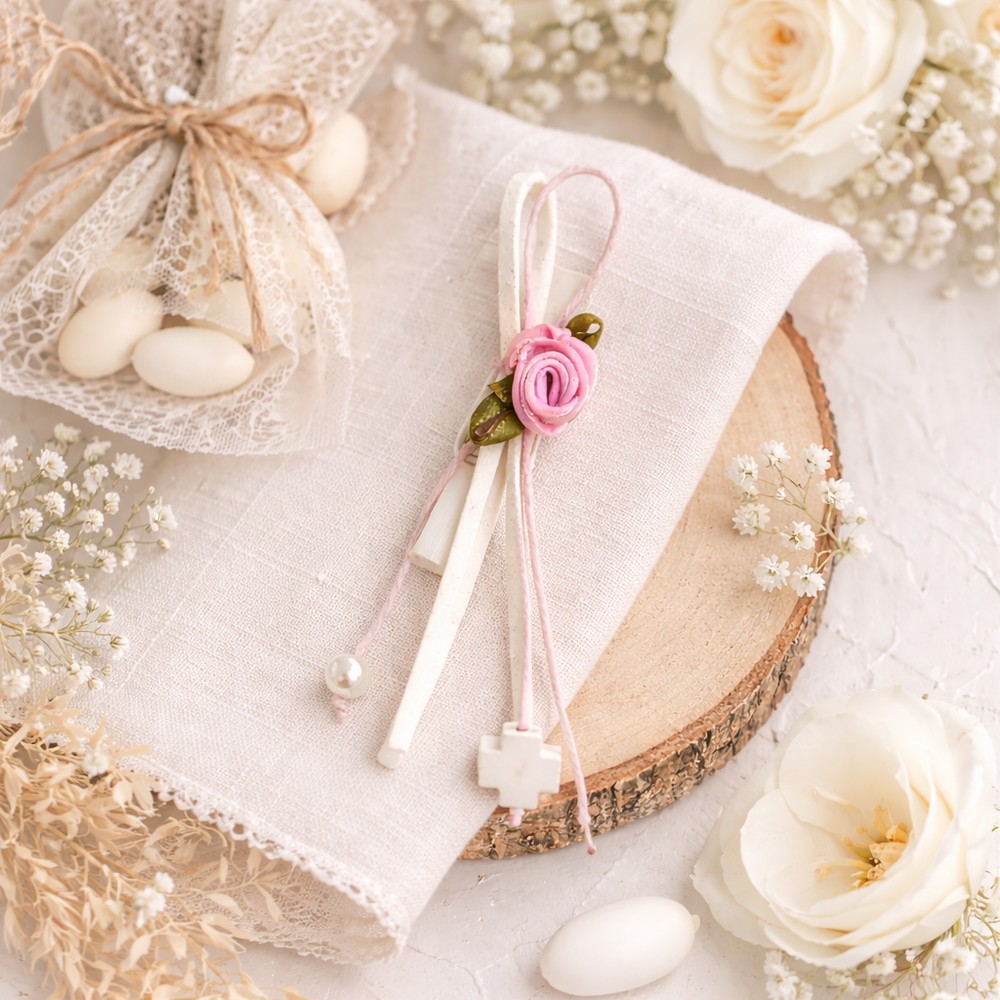 Μαρτυρικά Βάπτισης Πέτου με Ξύλινο πλακέ Λευκό Σταυρό και Λουλουδάκι σε Ξύλινο Μανταλάκι