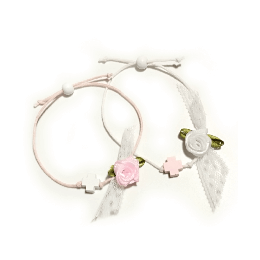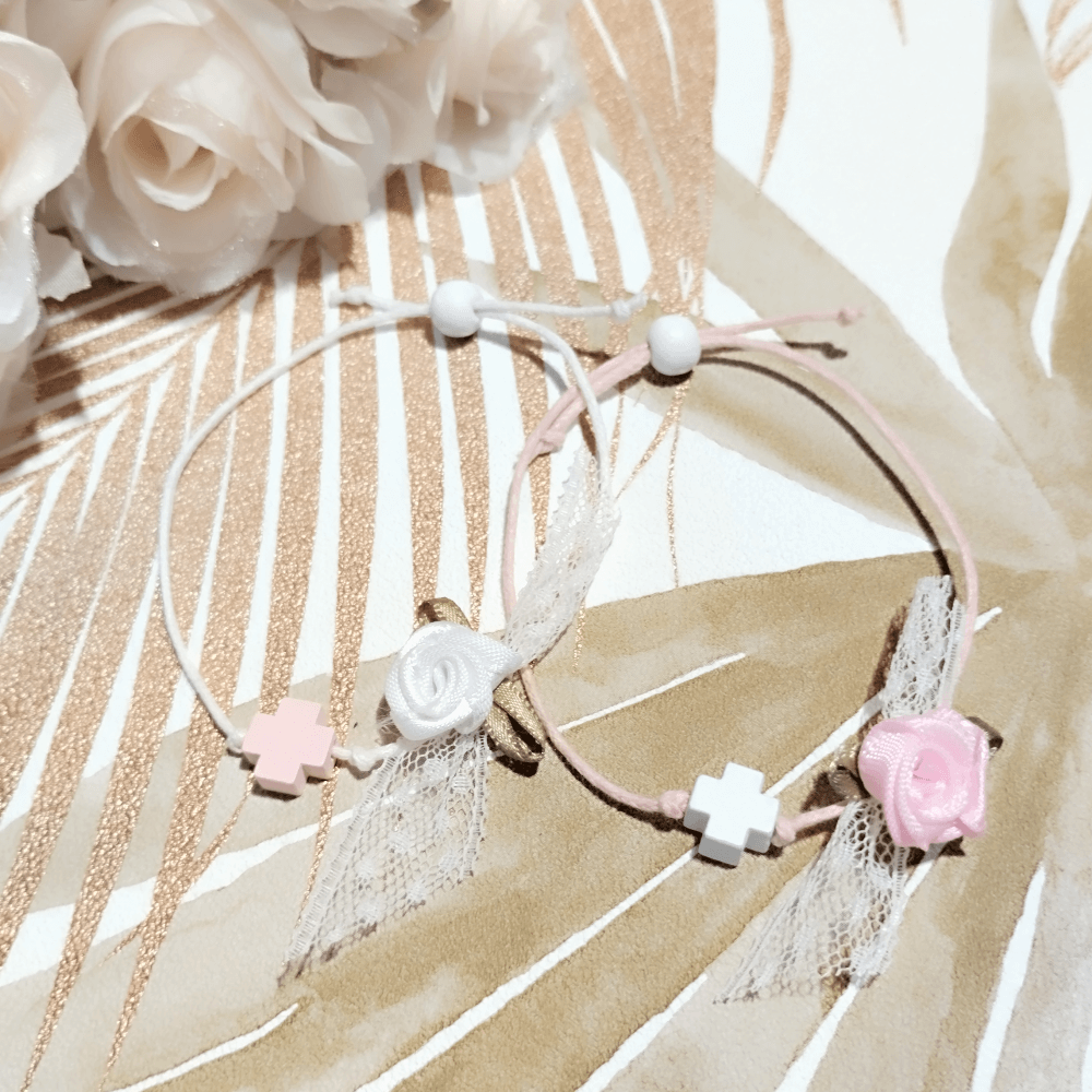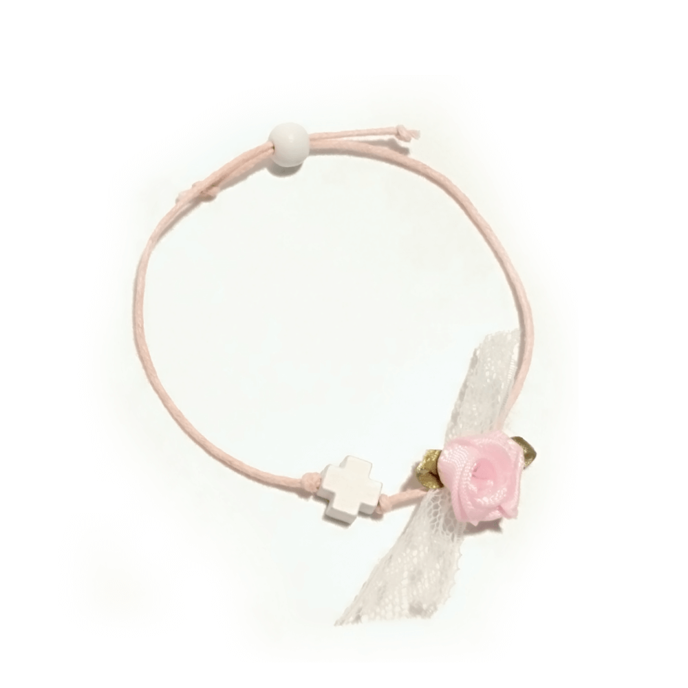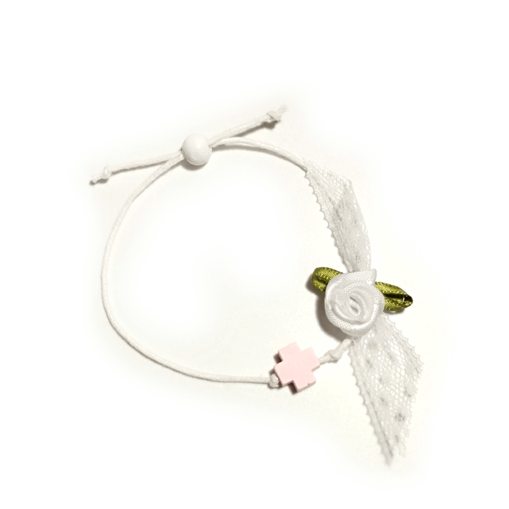 Στολισμένο με λευκή δαντέλα και λουλουδάκι.