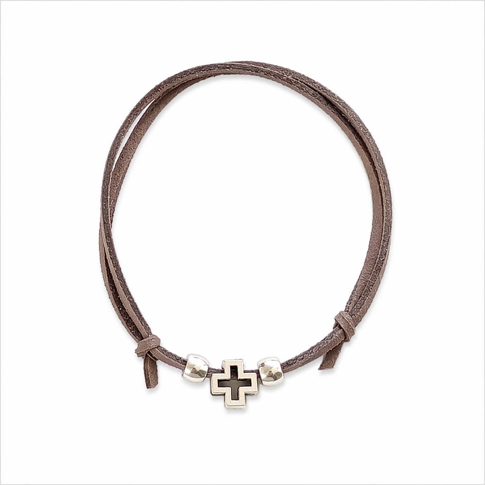 Μαρτυρικά Βάπτισης Βραχιόλι με Ασημί Σταυρό και Ασημί Χάντρες σε γκρι σουέτ δέρμα