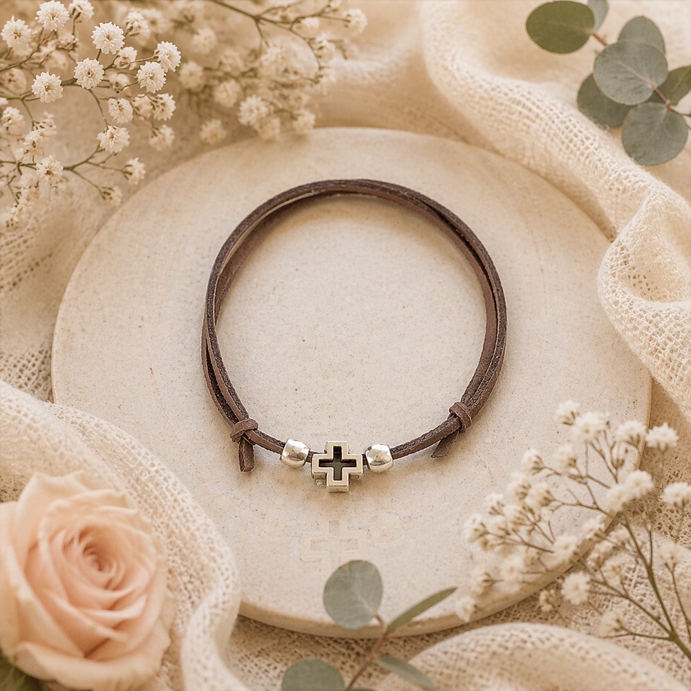 Μαρτυρικά Βάπτισης Βραχιόλι με Ξύλινο Σταυρό και Κεραμική Χάντρα σε φυσικό σουέτ Δέρμα