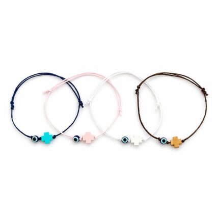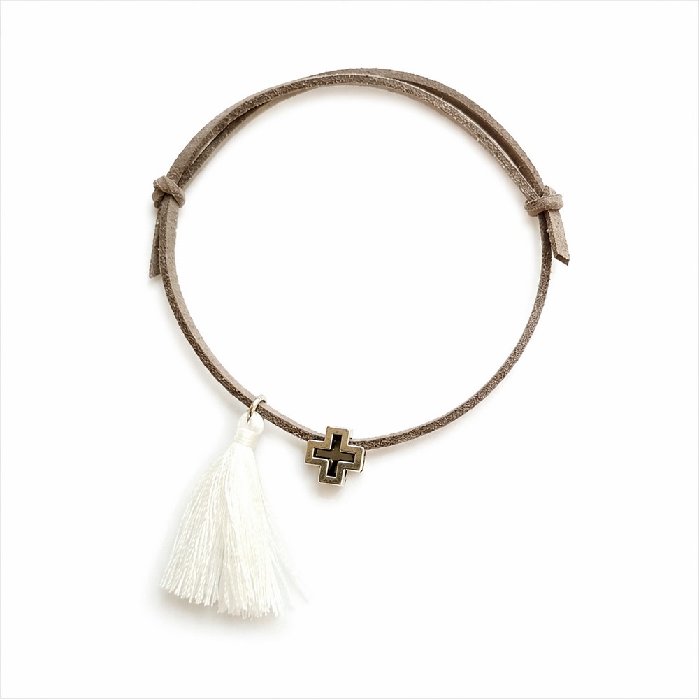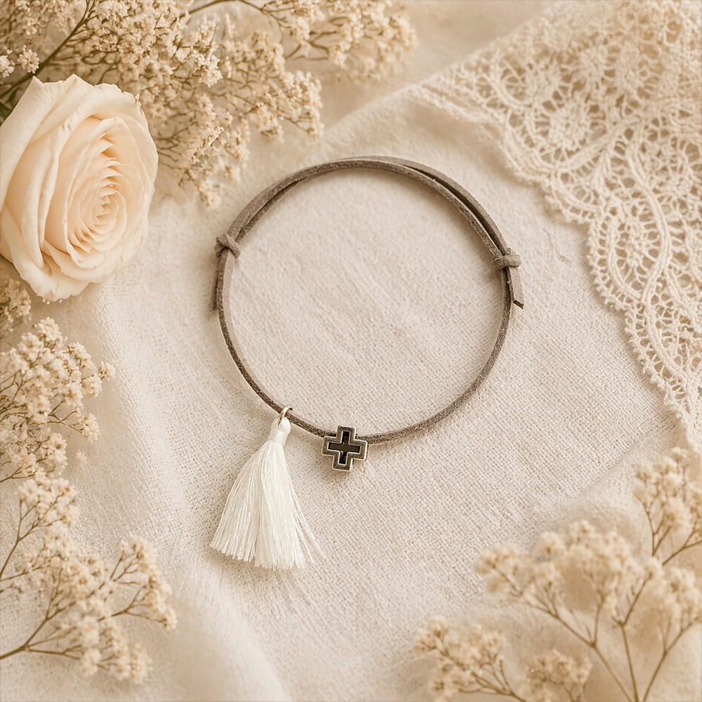 Μαρτυρικά Βάπτισης Βραχιόλι με Ασημί Σταυρό και Λευκή Φούντα σε γκρι σουέτ Δέρμα