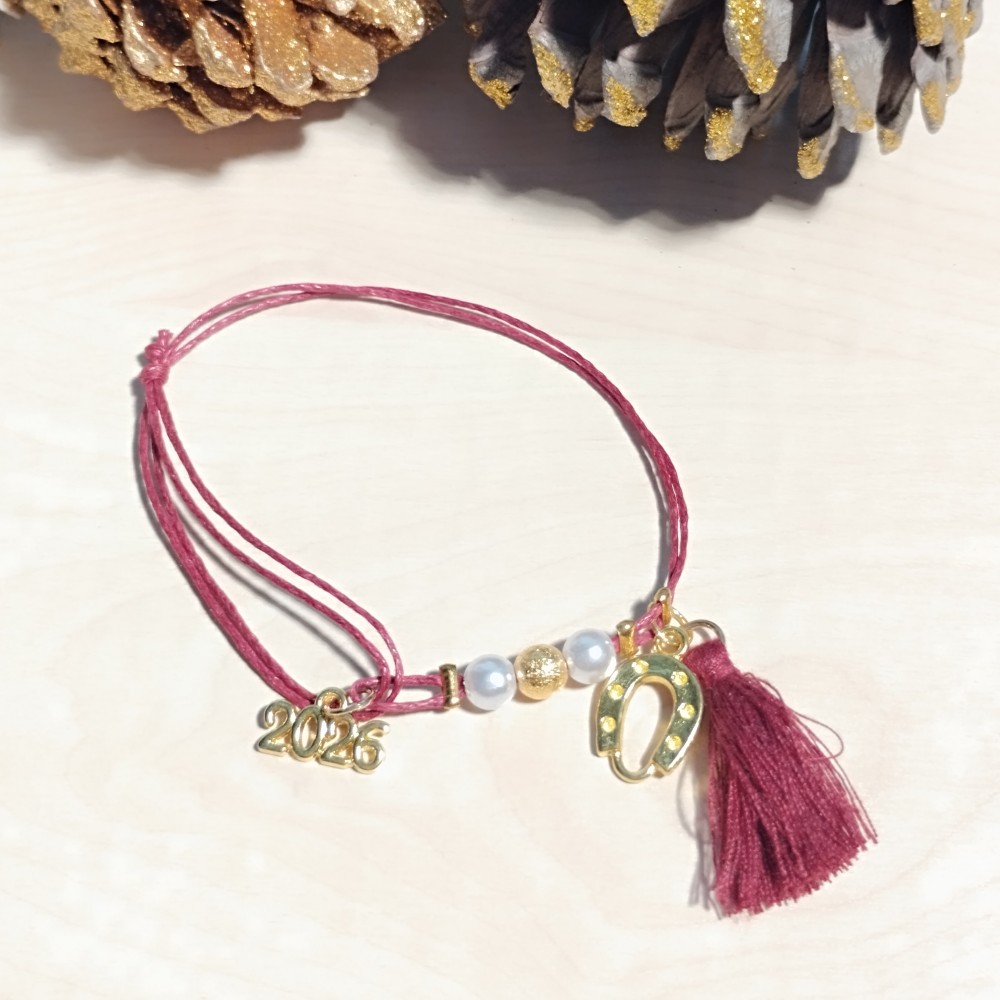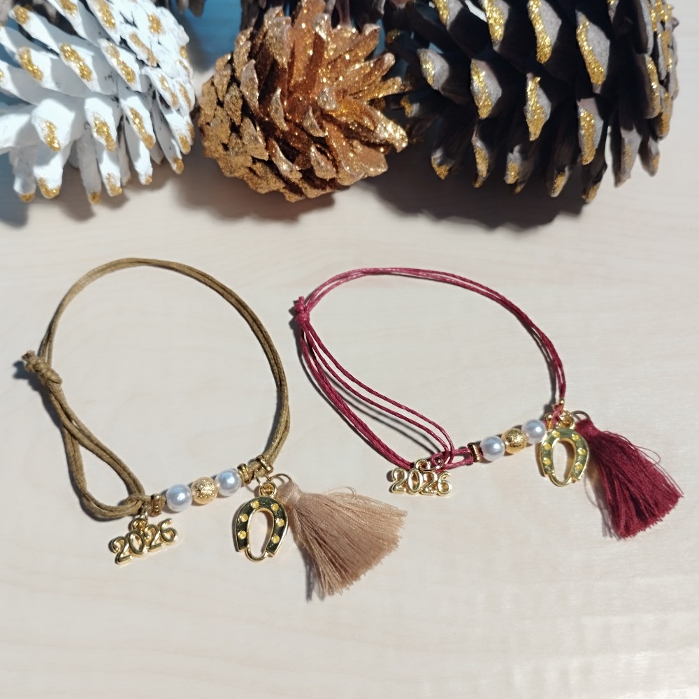 Οικονομικό χειροποίητο Γούρι 2026 βραχιόλι με χρυσό πέταλο σε μπορντό ή καφέ κορδόνι, αυξομειούμενο.
