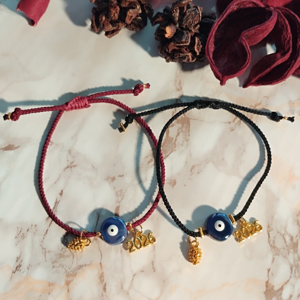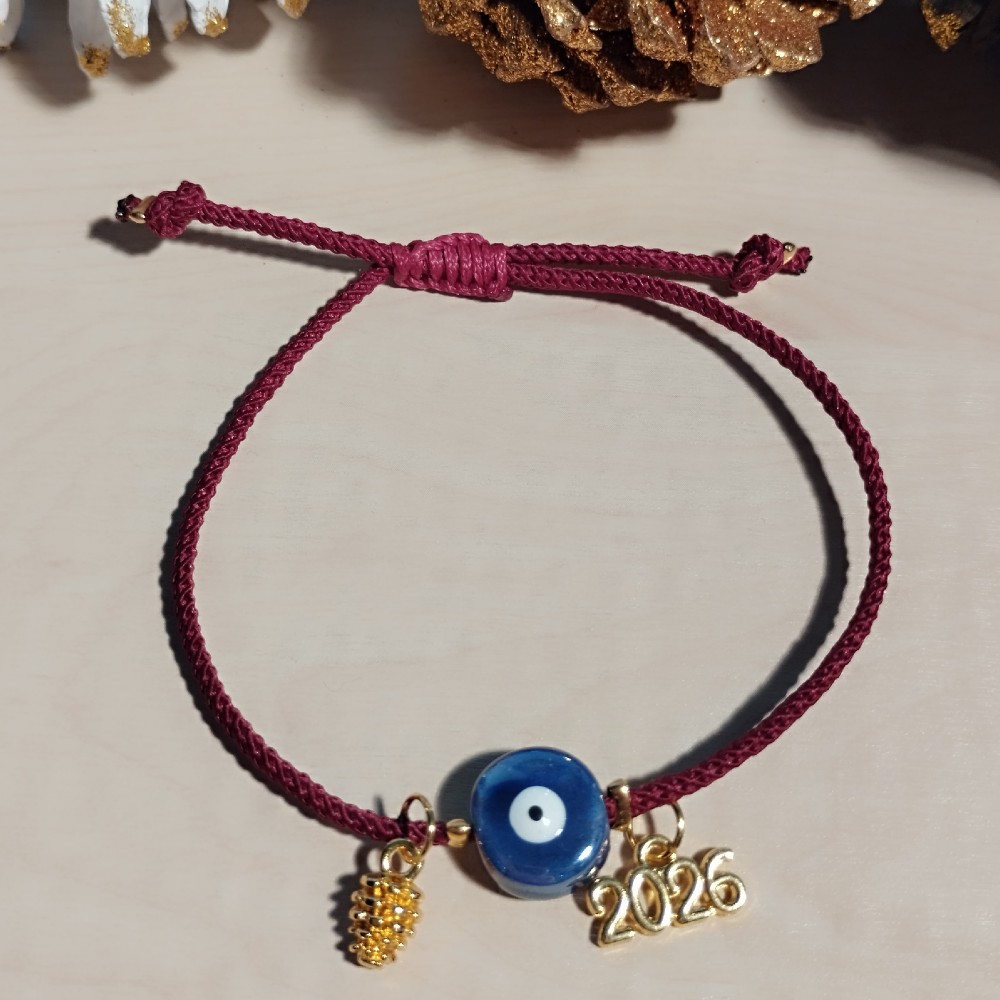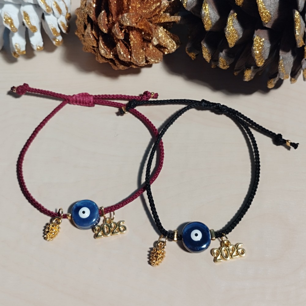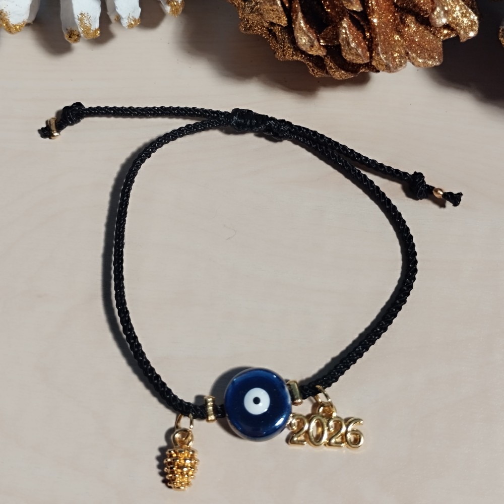 Οικονομικό χειροποίητο Γούρι 2026 βραχιόλι σε κορδόνι με κεραμικό μπλε μάτι και χρυσό κουκουνάρι, αυξομειούμενο.